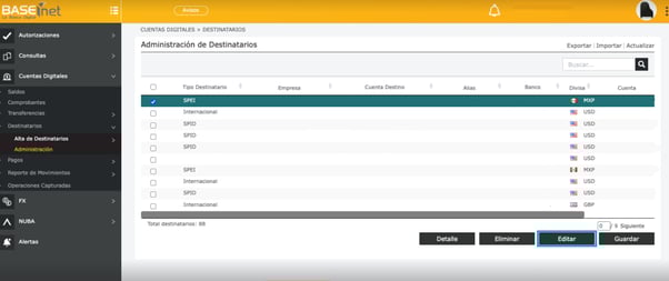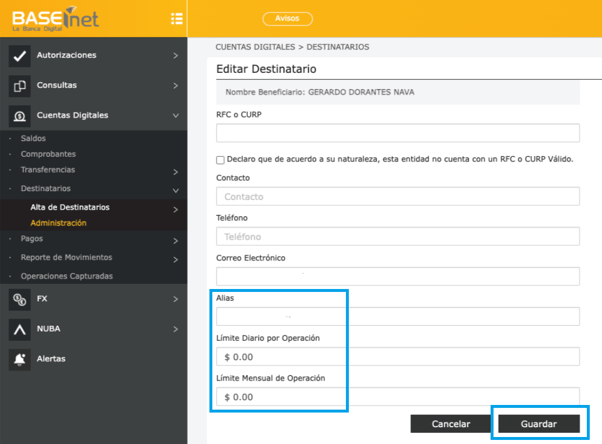 - En la barra lateral izquierda, selecciona la opción Cuentas Digitales > Administración. Se mostrará una lista de los destinatarios dados de alta. Busca y selecciona el destinatario al que deseas modificar los límites de operación.